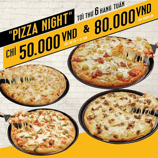 - Pizza chỉ 50k/miếng với trẻ em, 80k/miếng với người lớn