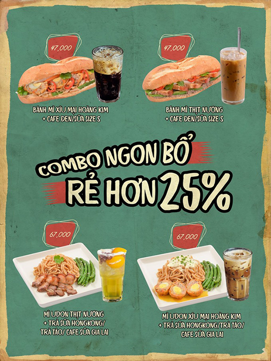 - Combo trưa: 01 mì udon (xíu mại hoàng kim hoặc thịt nướng) + 01 cafe sữa/trà sữa Hongkong/trà táo size S chỉ 67k