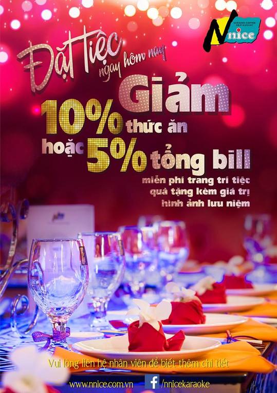 - Đặt tiệc giảm 10% thức ăn hoặc 5% tổng hóa đơn