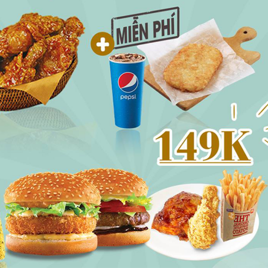 Với 149K bạn sẽ được ngay 1 combo: 1 miếng gà nướng, 1 miếng gà rán, 1 burger tôm, 1 burger Teriyaki, 1 long cheese stick, 1 khoai tây chiên M, 2 pepsi M (Giá gốc 224K, giảm 34% còn 149K)
