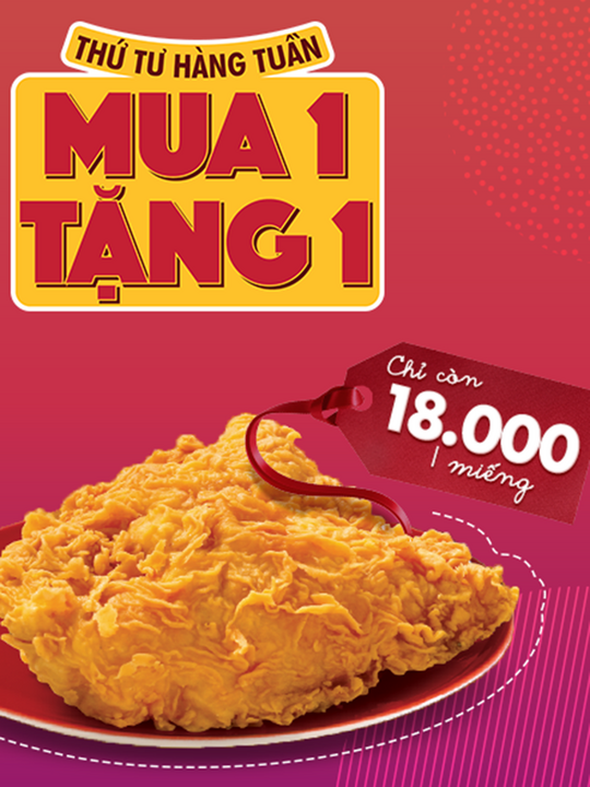 - Mua COMBO 2 hoặc 3 MIẾNG GÀ GIÒN + 1 NƯỚC sẽ được TẶNG NGAY 2 hoặc 3 MIẾNG GÀ GIÒN + 1 NƯỚC tương tự.