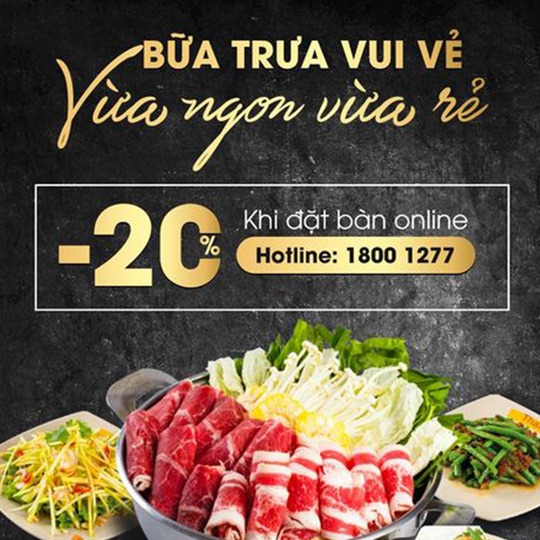 - Giảm 20% (chưa bao gồm VAT) cho khách hàng đặt bàn online